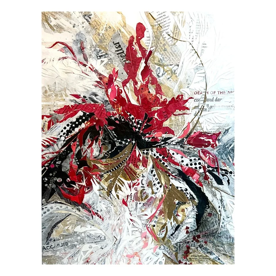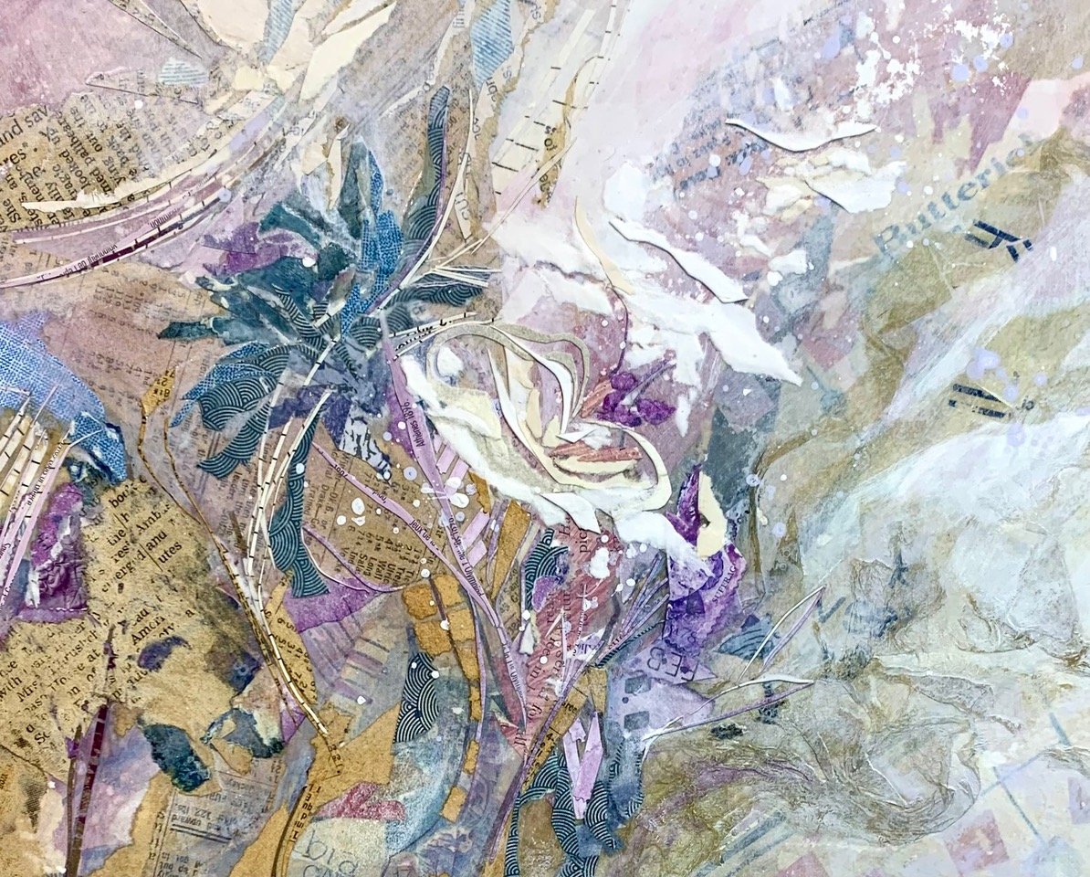 On the path to becoming a successful graphic designer and business owner, I have maintained my fine art skills. I found along the way, that chalk pastels and paper painting are my most successful and satisfying mediums. My first paper painting experimentation began in the fall of 2019, after my father (a fine artist himself) passed away. As I was tasked with packing up his home and all that comes with that, I found I had heaps of old letters, thousands of stamps, magazines galore and hundreds of vintage paper items. After lugging all these items to my studio, I began the sorting process.