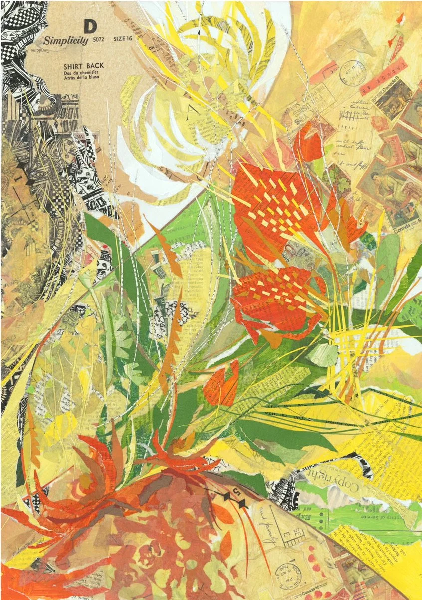 At the same time I was listening to the book, Ninth Street Women by Mary Gabriel. I began to simply let go of all my own previous artistic knowledge and design rules. I was truly inspired by those female trailblazers that came before me; to simply colour a piece of vintage paper, rip it however that might happen and lay it down on a large canvas. I did that same movement over and over until what appeared on my canvas was some kind of balance between colour, shape, size, edges, perspective and pattern. I couldn’t get enough of it. Every day for months I would enter my studio, create unique patterns on old magazine pages, ancient tissue, clothing patterns and on stamps. Often, I would doodle loosely in my sketchbook to help guide the fluidity of the next piece. But that was it. The act of creating these very unique paper paintings simply dripped from my hands. It wasn’t long after that I found my own “artistic and technical groove” in creating my paper paintings.